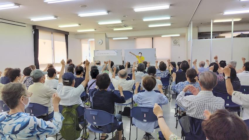 認知症の予防には「社会参加がとても大切」というお話しを聞き、身体を動かしながら楽しく脳トレを行いました。